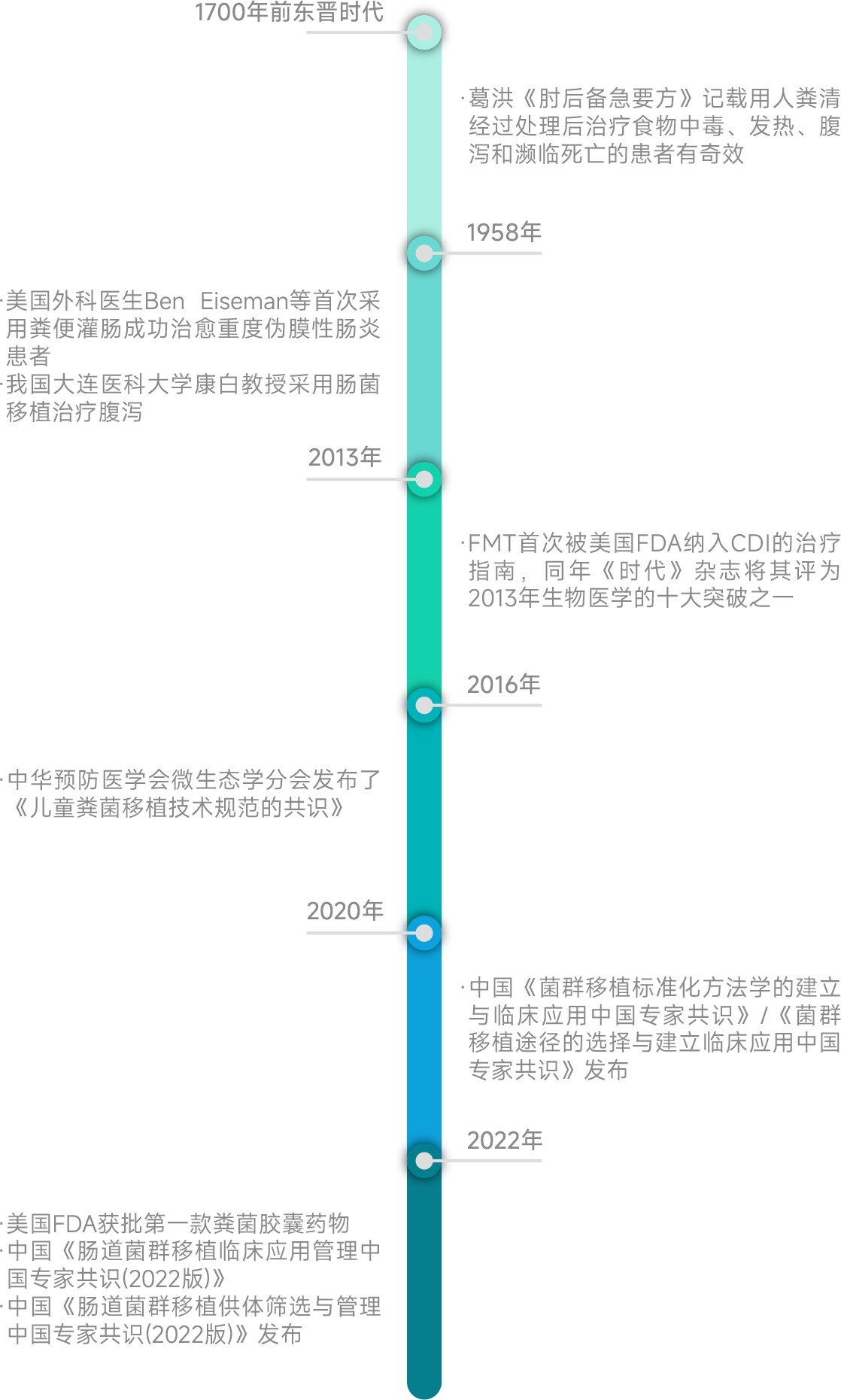 肠道菌群精准移植(FMT) 菌群移植(FECAL MICROBIOTA TRANSPLANTATION,FMT)是将健康人肠道提取物中的功能菌群通过一定方式移植到患者肠内,以调节肠道菌群失衡,重建具有正常功能的肠道微生态系统,达到对肠内肠外疾病的治疗或辅助治疗作用。 肠道菌群移植(FMT)的发展历程 肠道菌群相关疾病 肠道菌群移植的有效率 肠道菌群精准移植的流程
