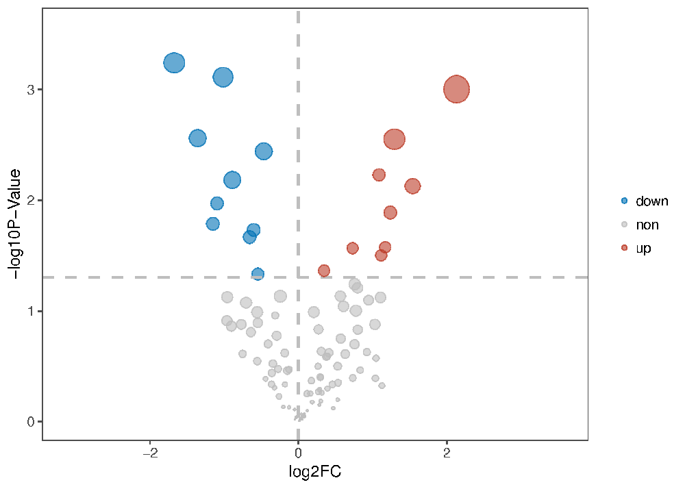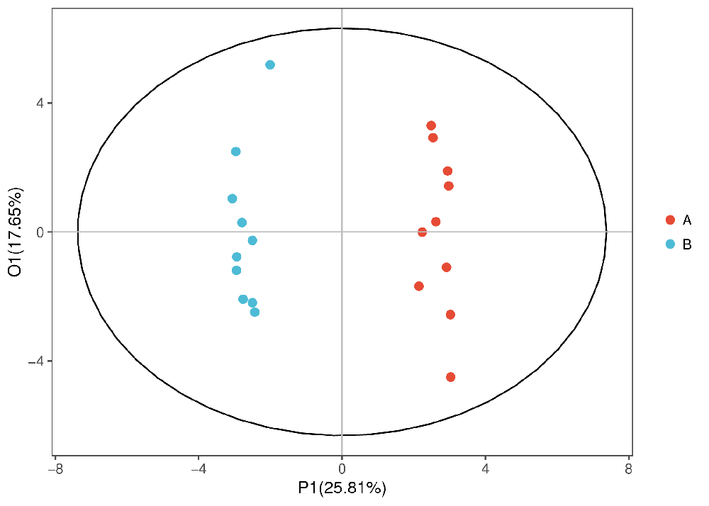 | 差异代谢物富集代谢通路气泡图 | 正交偏最小二乘法判别分析 | 差异代谢物火山图 |